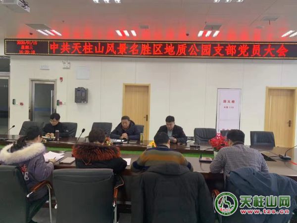 2020年1月15日,中共天柱山風(fēng)景名勝區(qū)地質(zhì)公園支部召開黨員大會(huì),支部全體黨員參加會(huì)議,風(fēng)景區(qū)黨委委員、天管會(huì)副主任王晨東蒞臨會(huì)議指導(dǎo)。