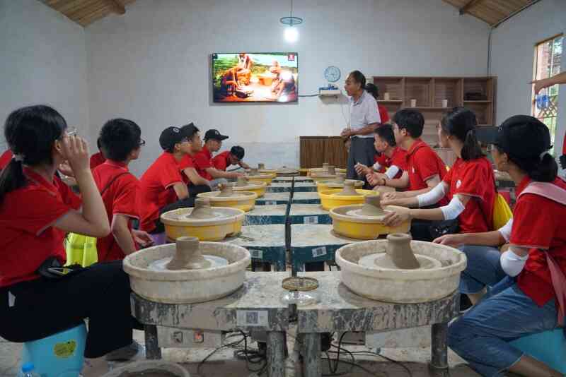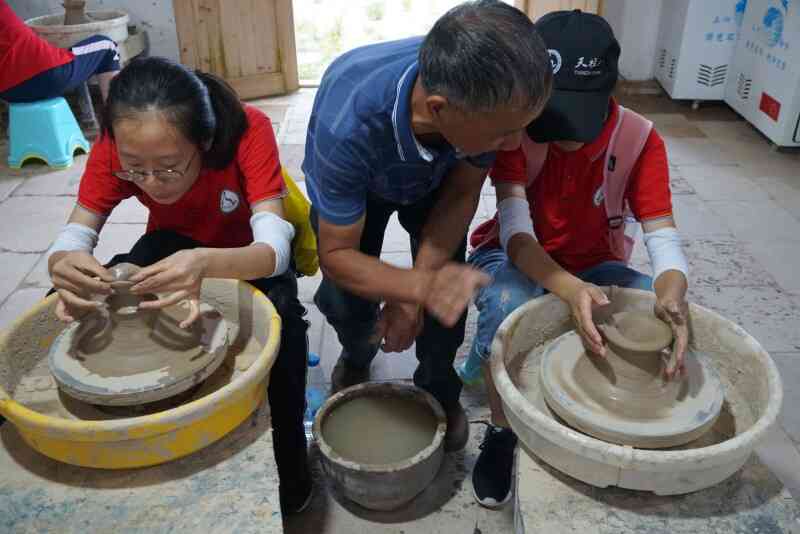 潛山市痘姆鄉(xiāng)素有“千年陶瓷之鄉(xiāng)”的美稱,陶器手工技藝距今已有6000多年的歷史,堪稱制陶史上的活化石。走進痘姆古陶,首先映入眼簾的是建于清代的龍窯,每個入火口都堆積了許多柴火,近處可感受到火的炙熱溫度。走進屋內(nèi),可見眾多精美的古陶制品擺放在木架上,富有文藝復古氣息。營員們在陶藝師傅的指導下,親自體驗了制胚過程,看到自己親身制作的泥坯作品展示在眼前時,無不興奮激動,這既能感受到傳統(tǒng)文化的藝術魅力,也能激發(fā)他們爭做非物質文化遺產(chǎn)繼承人的決心。