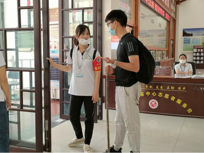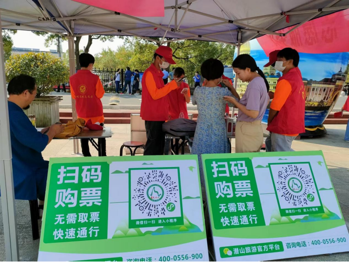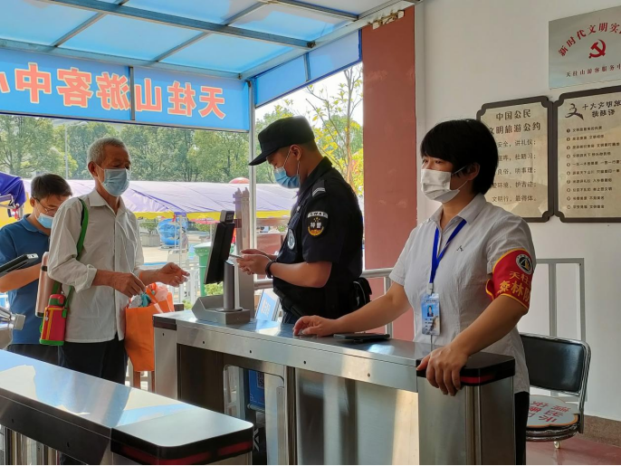 秋日明媚,天空湛藍,天柱山景區(qū)彩旗飄飄,游客絡(luò)繹不絕,歡聲笑語中更顯節(jié)日濃厚的喜慶氛圍。“尊敬的游客,請佩戴好口罩,保持一米間距”“請到這邊來掃安康碼”身穿紅馬甲,頭戴小紅帽的天柱山旅游志愿者的語音在游客中心廣場上此起彼伏。